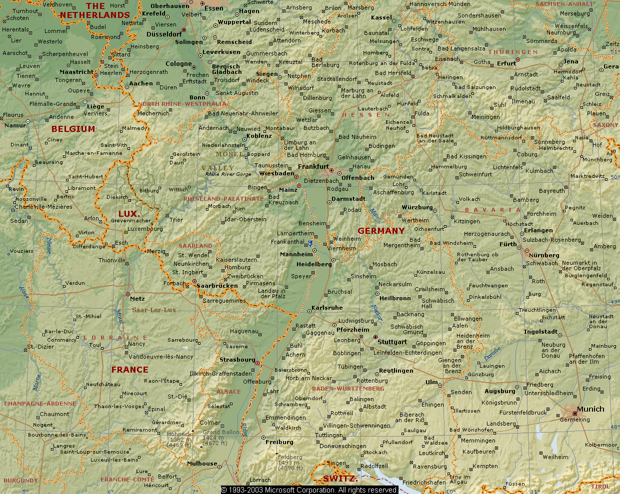 Oppau, Germany is in the Palatine area, just a few miles northwest of Mannheim, just a few miles from the Rhine. Here are some maps that show its location. Oppau is in the center of each map, where the little pushpin is. The maps are quite large -- about 450K each. Many people immigrated to the US from Oppau in the first part of the 18th century. Many of those who immigrated went to the Palatine area of Pennsylvania near York, with many others going to Meigs County, Ohio. Here is a discussion group about them. Oppau and the neighboring village of Edigheim have been long occupied. The first documentary mention of Edigheim was in 772 and, for Oppau, 808. |